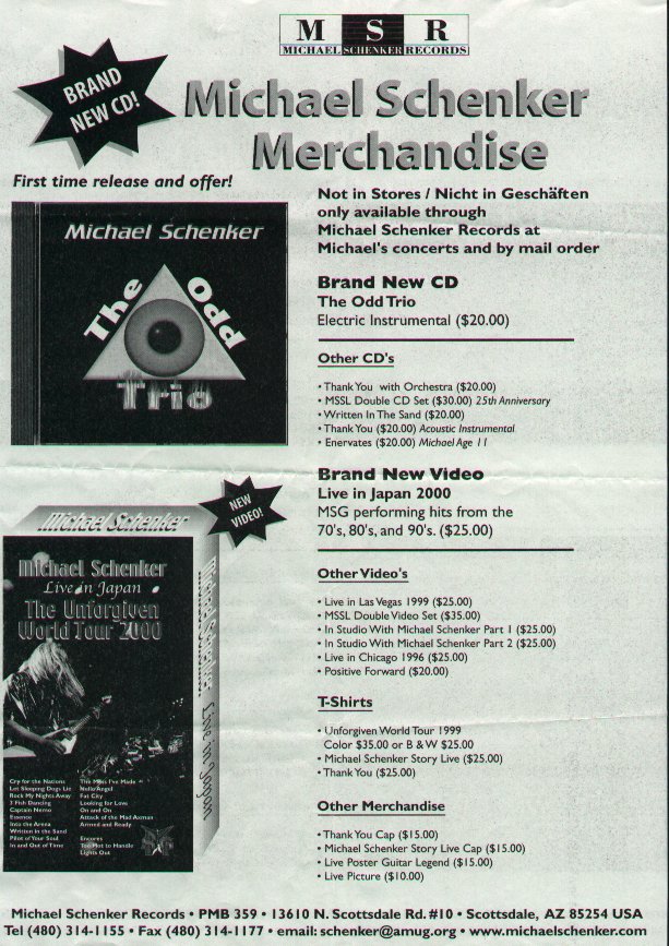 MS2K: MSRの販売担当ベラによると、Michael Schenker 2000は現在在庫切れてるようで、再発売は2001年1月10日以降になるとか。よってMSRに注文される方はお気をつけください。