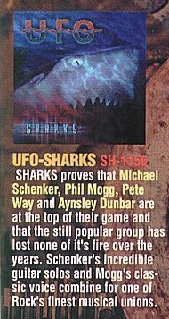 Sharks広告:米ギター雑誌「Guitar Player」最新号にシュラプネル・レコーズのニュー・リリースの広告が掲載されています。そのひとつがUFOの新作Sharksです。「Schenker's incredible guitar solo!」との表現もあります。 Thanks, Tom.